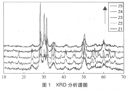 圖1 給出了溶膠-凝膠法制備的納米二氧化鋯的X 射線衍射分析圖譜, Z1~Z5 分別為ZrO2- AP-350℃、ZrO2- AP- 600℃、ZrO2 - AP- 800℃、ZrO2 - CP-400℃、ZrO2- CP- 600℃樣品的X 射線衍射分析圖譜。參考衍射主峰的位置和形狀, 從結晶狀況來看,Z3 的峰形比較尖銳, 結晶度要更高一些。從Z4 和Z5主峰的比較來看, Z4 的峰形比較尖銳, 結晶度高, 晶格缺陷比較厲害。Z5 與Z3 的結構形態相似, 已經傾向于無定形狀態, 其峰形較寬、較低, 其粒徑應該最小, 而比表面積最大。從上述分析可知, 隨著焙燒溫度的增加, 產品的結晶度增大。