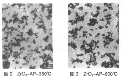 圖2、圖3 和圖4 為ZrO2- AP- 350℃、ZrO2- AP-600℃和ZrO2- AP- 800℃樣品的TEM結果。從圖中可以看出當焙燒溫度為350℃時, 樣品分布比較均勻, 粒徑較小; 當培燒溫度為600℃時, 顆粒變大, 形成分布不均勻的球形顆粒; 而當焙燒溫度上升至800℃時, 顆粒之間的團聚非常明顯, 粒徑明顯增大,形成不規則顆粒。從上述分析可以看出, 隨著焙燒溫度的增加, 產品的粒徑增大, 團聚現象也更加嚴重。